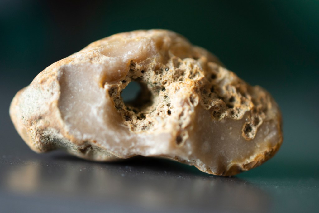 In the above case the camera was positioned in front of the stone. This allowed shadows to be visible inside the hole through the stone and some of the pitting. The left hand of the stone appears brighter, and the colour a lot more muted, than the right-hand side where the colour of the stone is much stronger.