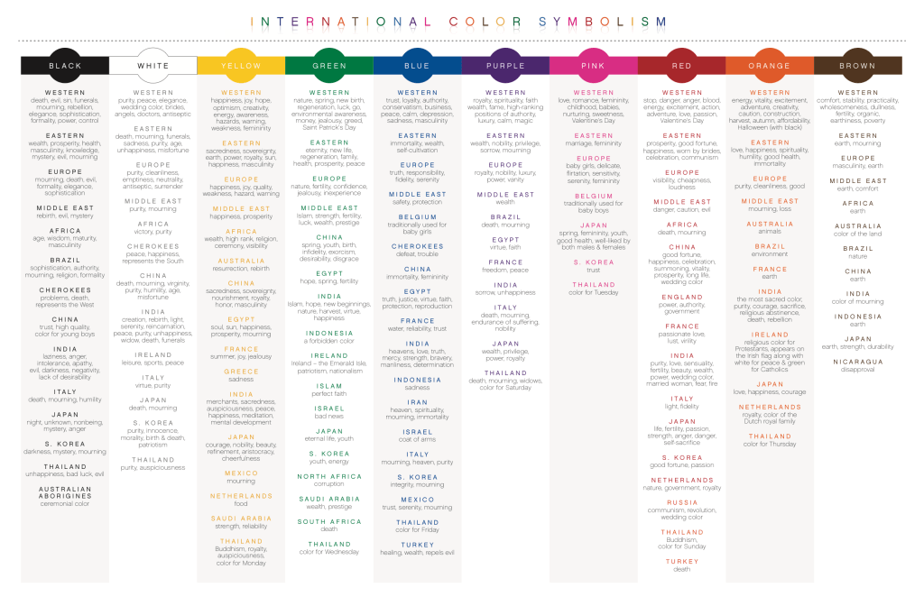 When it comes to concepts, however, the colour associated with some topics is different depending on culture. For instance in the Western world the colour black is associated with mourning, however, in Eastern countries it is white, in other areas around the world it is red, purple, blue yellow or even brown.